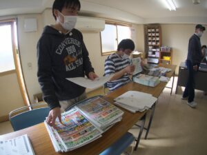 14枚のチラシを順番にセットして、袋詰めします。最後には、職員Kが正しくセットできているか厳しくチェックします。