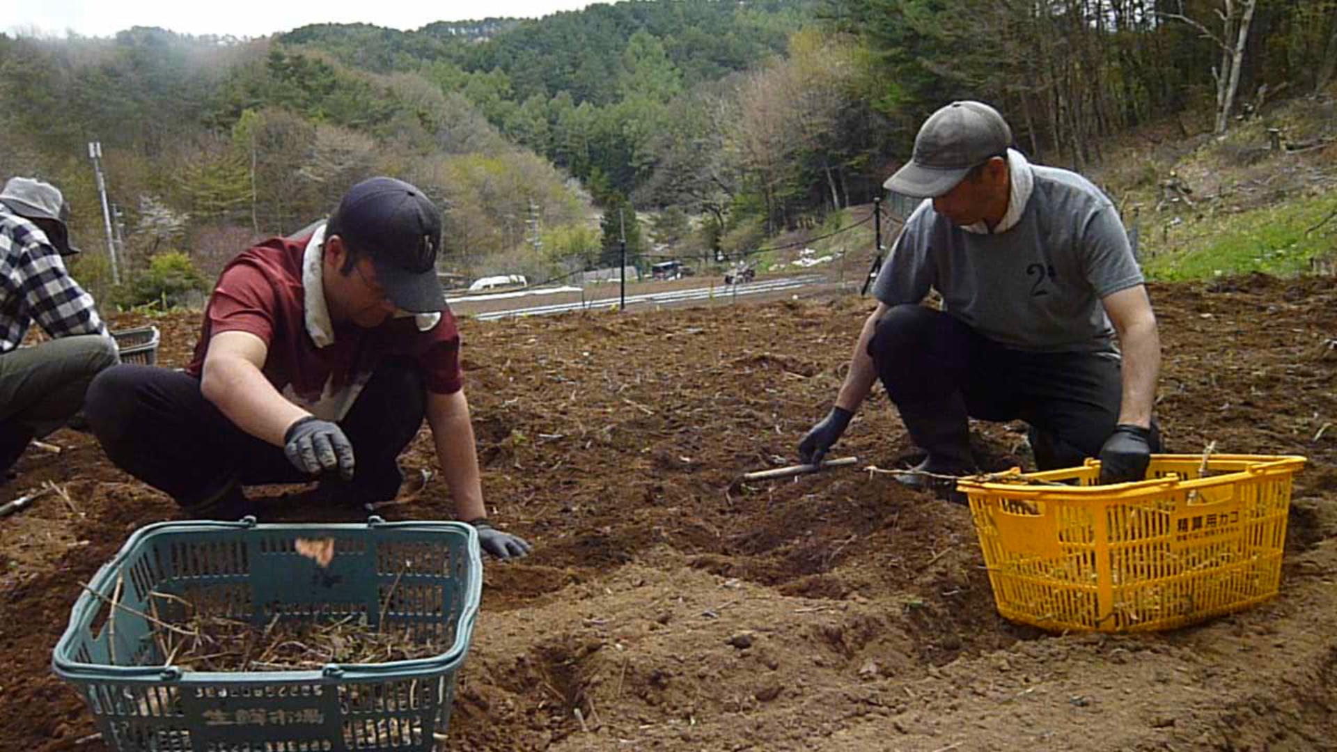 今日は農家の畑仕事のお手伝いです。土の中の笹の根っこなどを丹念に拾います。